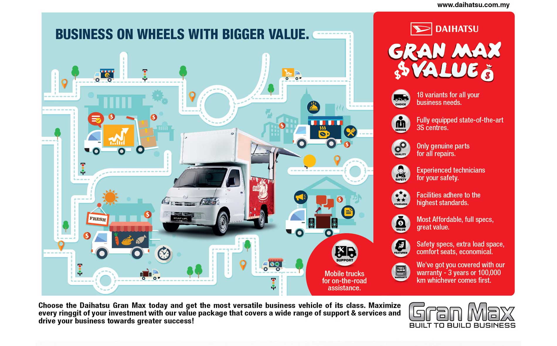 As the food truck trend continues to accelerate in Malaysia, this exercise focused on promoting the Daihatsu food truck variant. Via an attractive visualization of a graphic map / board game design, this print ad illustrated the visual story that wherever you are and whatever your food truck business, the Daihatsu Gran Max is the obvious choice for best value.
