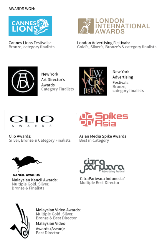 Widely recognized in the advertising and film industry regionally, Steven has picked up many awards. This includes Cannes Lions, New York Fests, London International Ad Awards, Clios, Asian Spikes and the Malaysian Kancils. Uniquely, he has been garnered with the Best Film Director awards in Malaysia and Indonesia as well.